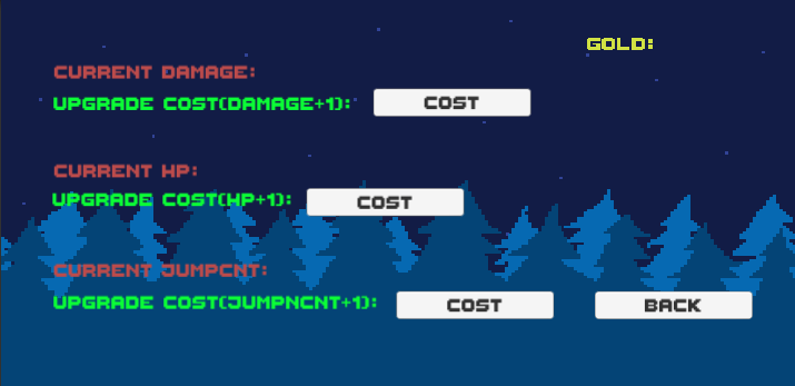 그리고 우측에는 현재 GOLD와 DAMAGE, HP를 확인 할 수 있습니다. JUMPCNT도 캐릭터가 약간 일정거리를 순간이동 하는 기능을 넣고 이를 스테이지마다 횟수를 제한 시킬 목적으로 일단 두었지만 기능은 구현하지 않았습니다.