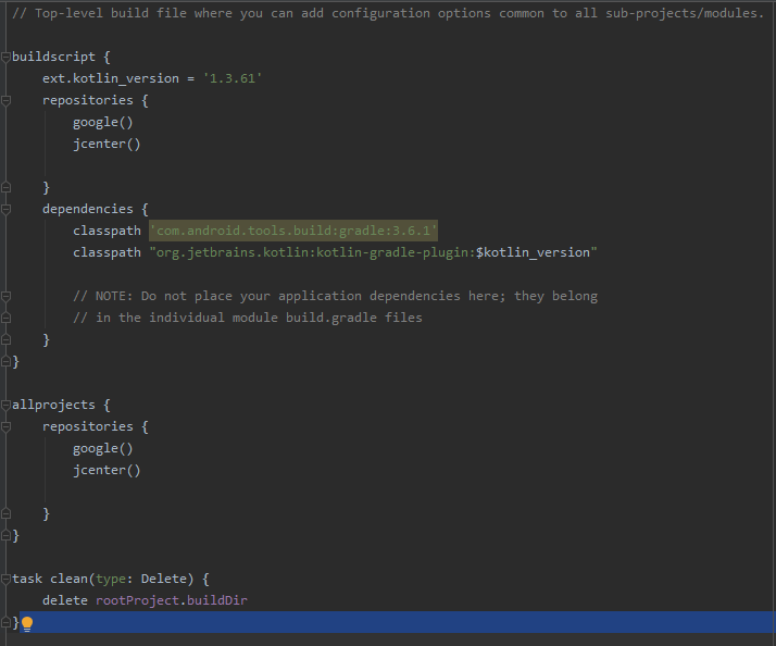 - 기본적으로 gradle은 최상위 수준(프로젝트) 의 빌드 파일이 존재합니다. build.gradle(Project: 프로젝트 이름) 과 같은 형식이며 기본 내용은 아래와 같습니다. jcenter, google repository를 사용해서 원격 라이브러리를 얻는 다는 것 등의 내용이 있는데 대부분의 경우 이 파일은 우리가 변경하지 않습니다.