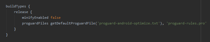 - ProGuard 기능을 지원합니다. ProGuard는 자바 바이트 코드를 최적화하고 크기를 줄여서 효율적으로 만드는 역할을 해줍니다. Gradle build 파일에서 이 기능을 실행 할 것인지 여부를 제어 할 수 있습니다. 아래의 사진을 보면 Module의 gradle 파일인데 minifyEnabeld false 라는 문장이 있습니다. 이 것을 true로 변경하면 ProGuard를 실행 하는 것입니다. default는 false로 되어 있습니다.