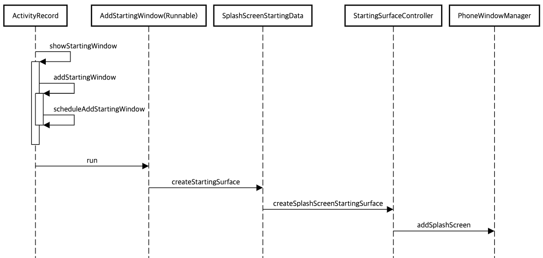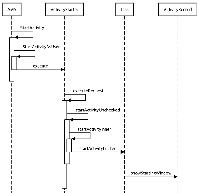 위의 SequenceDiagram은 Activity호출 프로세스를 보여주고 있다. ActivityManagerService(AMS)에 의해 시작되며 Task에서 ActivityRecord의 showStartingWindow()의 호출로 startingWindow를 보여주기 시작한다.
