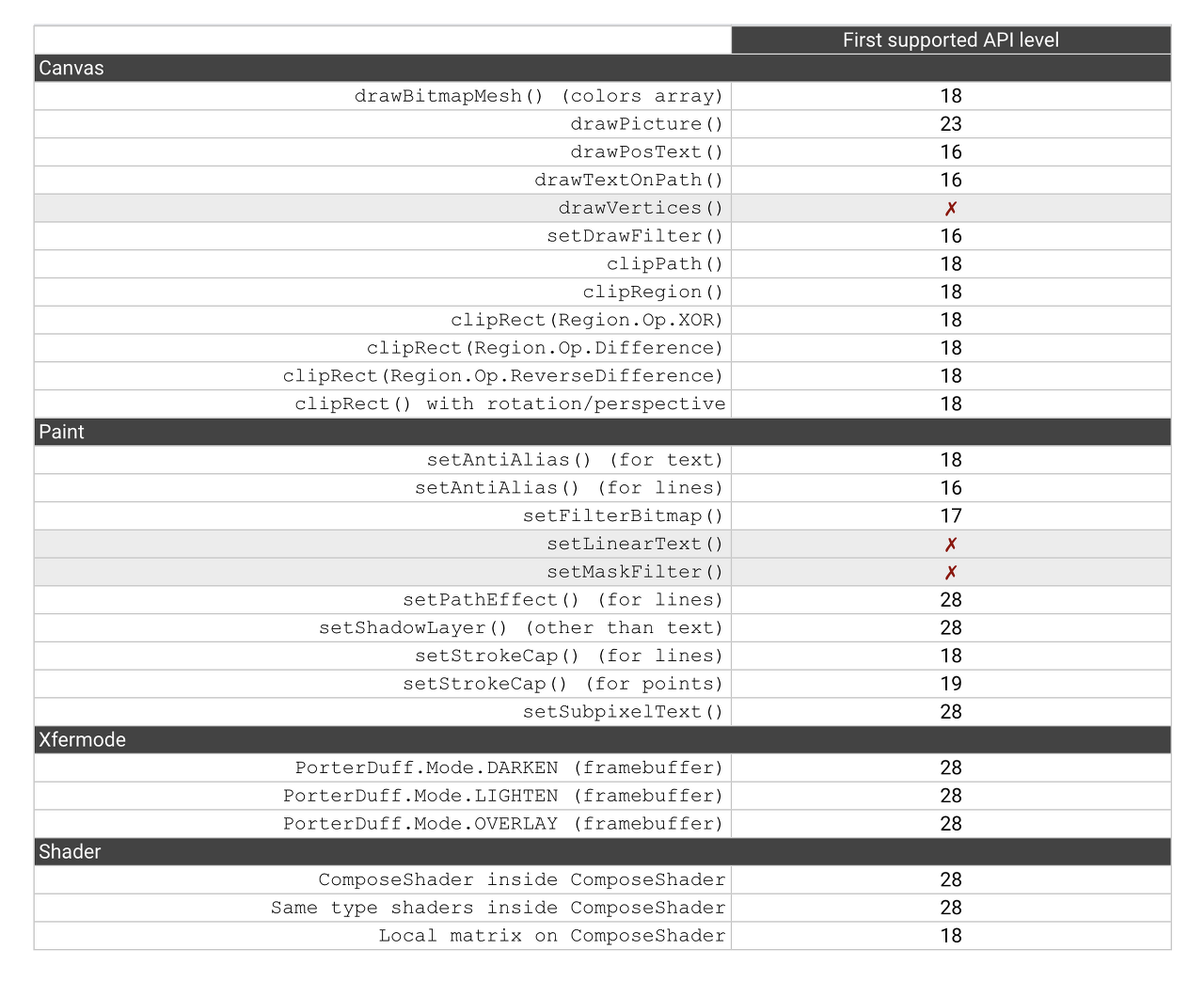 시간이 지남에 따라, 범용 3D엔진을 가진 디바이스가 출시되면서 안드로이드는 렌더링에 OpenGL ES를 적용했다. 때문에 예전 API를 사용한 앱 뿐만 아니라 프레임워크 코드가 제대로 동작하게 하는 것이 중요했다. 따라서 이를 위해 하드웨어 가속 Canvas API가 등장했다(이때가 Android 3.0(API level11)이다. 다음문서에서 확인할 수 있듯 이 API들의 지원에는 우여곡절들이 있었다. View의 onDraw() 함수에 제공된 Canvas는 하드웨어 가속이 가능하지만, App이 lockCanvas() 함수를 가지고 직접 Surface에 lock을 걸어서 얻은 Canvas와는 다르다는 것을 특히 주의해야 한다.